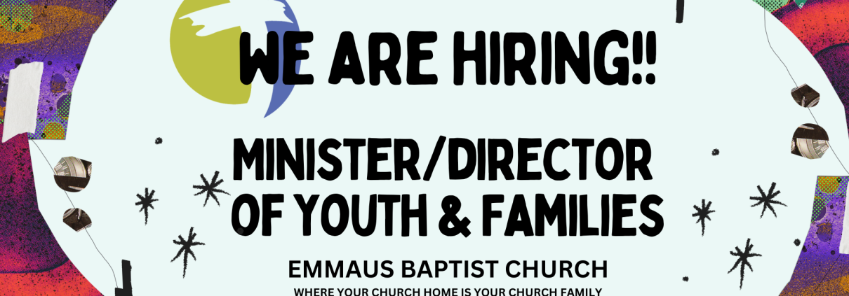 Emmaus Baptist Church is seeking a full-time Minister/Director of Youth and Families responsible for all aspects of youth ministry (grades 6– 12) and ministry to families of young adults, including parents of ebcKids and Youth, families without kids, and single adults, all ages 45 and younger. The Director/Minister will be responsible for developing, organizing and implementing a comprehensive ministry in worship, discipleship and outreach while serving as a spiritual leader and role model.