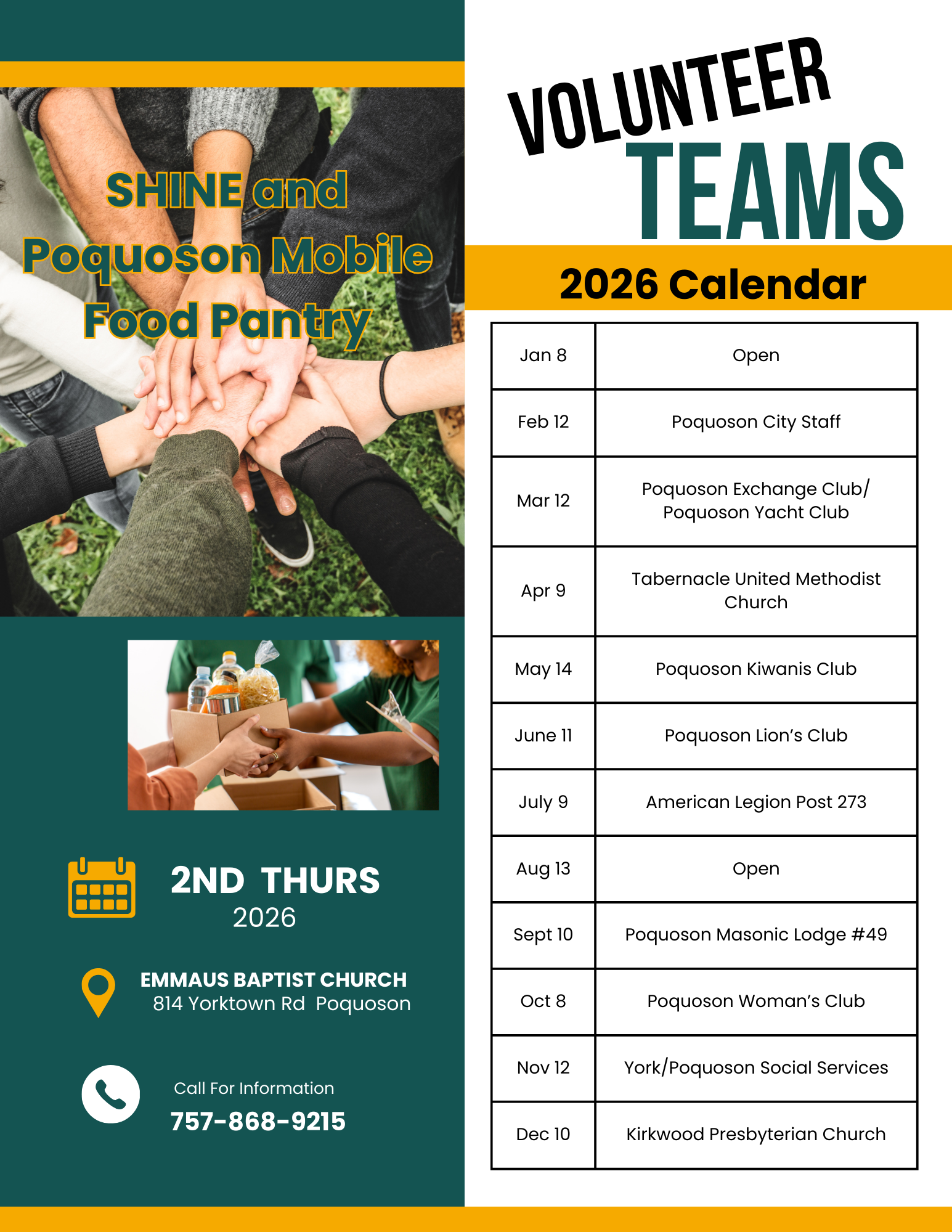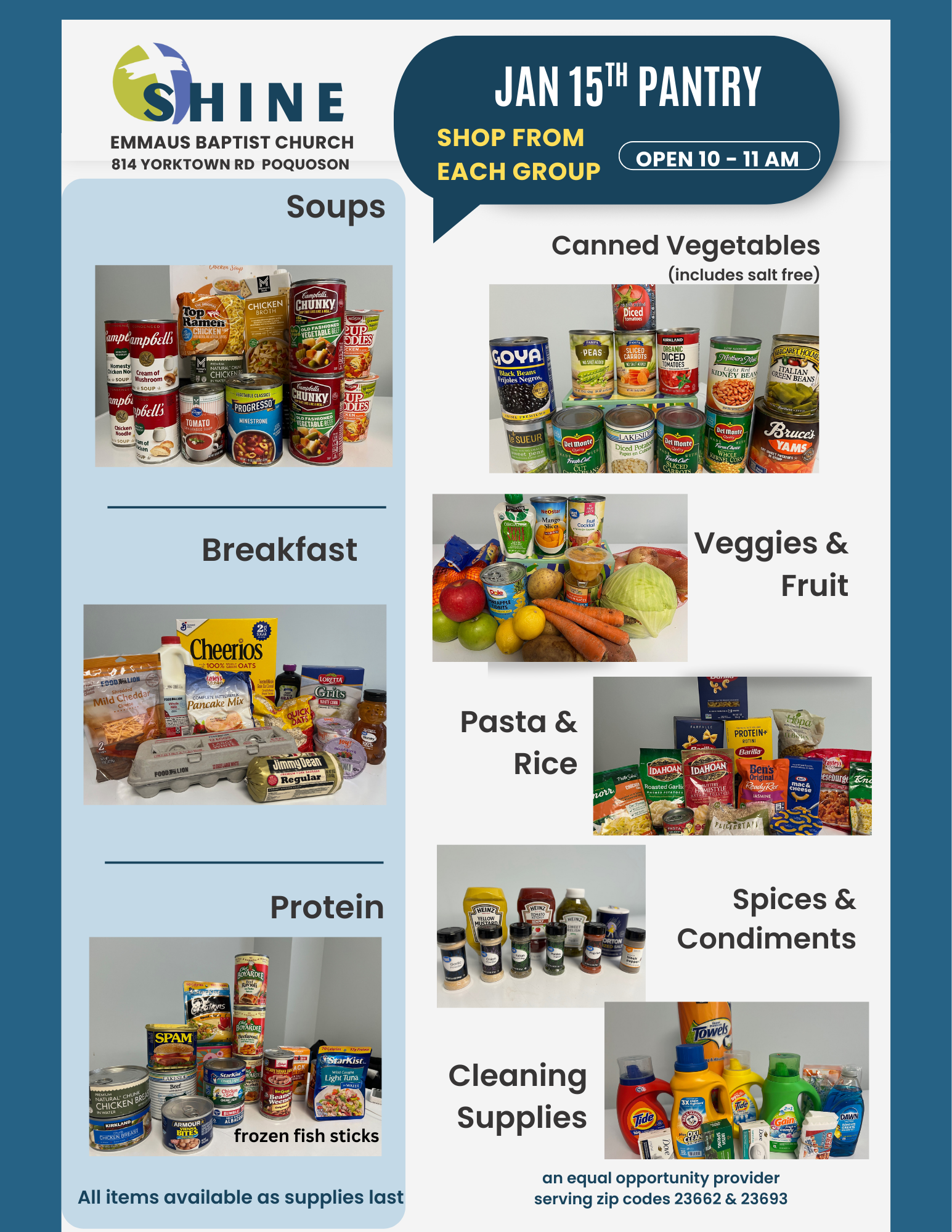 In September 2025, Emmaus BC became a Partner Agency with the Virginia Peninsula Foodbank, expanding beyond the monthly distribution to serve residents of Poquoson and York County in zip codes 23662 and 23693. Residents who are unable to participate in the morning distribution may preregister for pick-up in late afternoon, made based on the supplies available at noon. Limited deliveries may be requested within Poquoson.