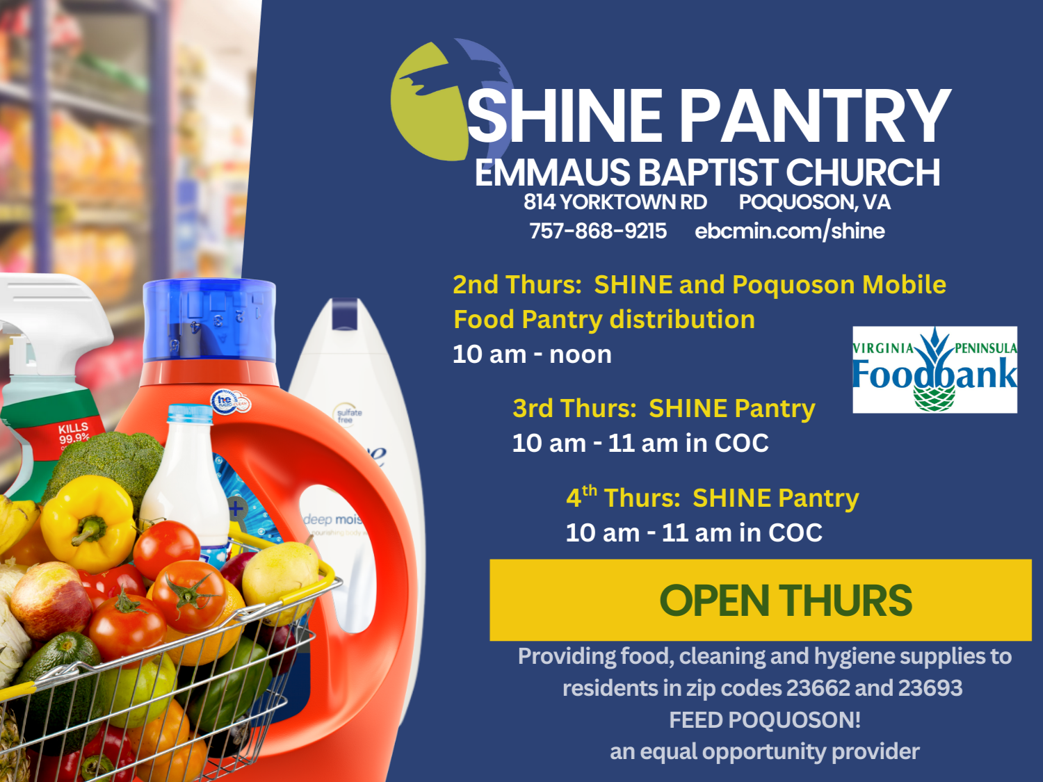 SHINE at Emmaus joined with the Poquoson Mobile Food Pantry in February 2022 to provide cleaning products and hygiene items at the monthly food distributions held on the 2nd Thursday from 10 am until noon. Each month a group of items selected from laundry detergent, dishwashing detergent, paper towels, shampoo, soap, toilet paper, toothpaste, toothbrushes, and similar products is distributed.