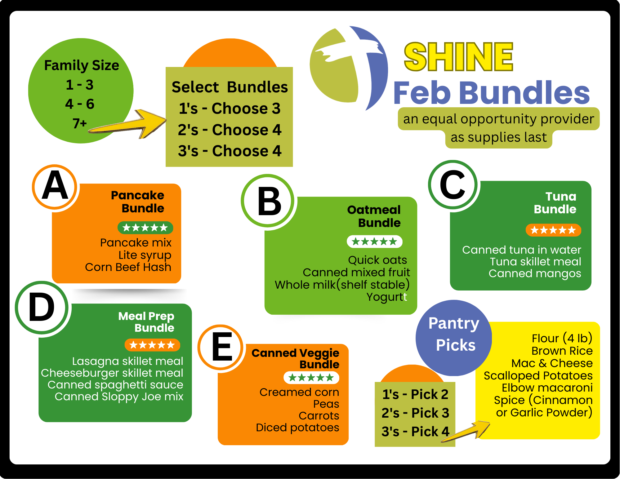Pantry totes (mixture of the following): Pancake mix and syrup, Oatmeal, Shelf-stable milk, Tuna, Cornbeef hash, Skillet mixes, Canned Veggies, Pantry Picks
